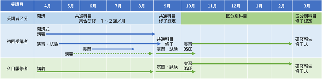 研修期間は1年間です。主にeラーニングで自己学習と演習、数回の集合研修により働きながらの受講が可能です。共通科目の研修を修了後、各々の選択した区分別科目研修にすすみます。実習は所属施設で行うことを基本とします。