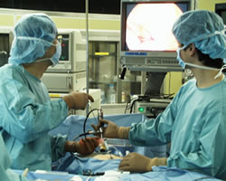 この他、体の奥深く、たとえば横隔膜の上下や骨盤腔の底などでは、通常の開腹・開胸手術では時に執刀医しか覗くことができないような手術になりますが、このような腹腔鏡カメラを使った手術では、画面がモニターに映し出されるので、執刀医ばかりでなく助手、看護婦など手術に参加するスタッフ全員が執刀医の作業を見ながら、それぞれの仕事をすることができます。