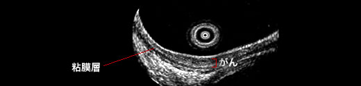 内視鏡の先端につけた超音波装置によって、食道内腔から癌の深さを精密に評価します。内視鏡的粘膜切除で切除可能な癌の診断に不可欠です。また、食道の外側にあるリンパ節の診断にも有用です 。