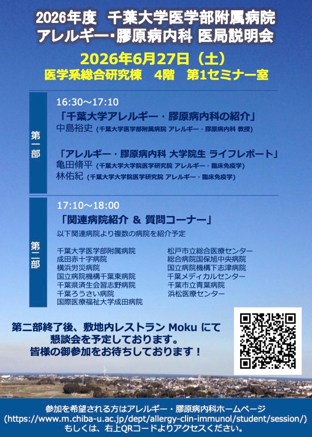 6月27日(土)に2026年度医局説明会を行う予定です。中島教授による千葉大学アレルギー・膠原病内科の紹介および、所属大学院生による「アレ膠大学院生ライフレポート」も開催される予定です。関連病院紹介&質問コーナーも開催予定です。