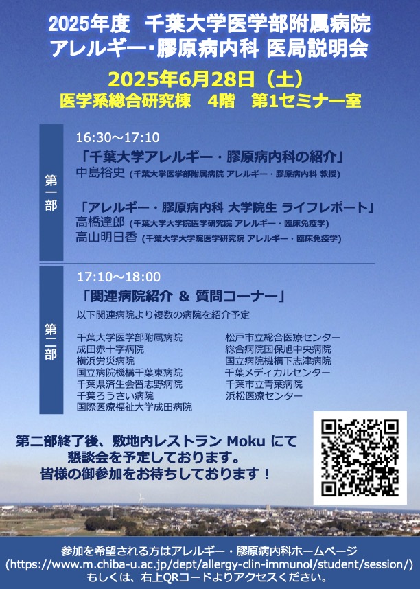 6月28日(土)に2025年度医局説明会を行う予定です。中島教授による千葉大学アレルギー・膠原病内科の紹介および、所属大学院生による「アレ膠大学院生ライフレポート」も開催される予定です。関連病院紹介&質問コーナーも開催予定です。