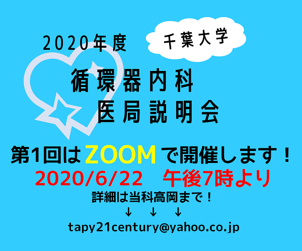 2020年度の第1回医局説明会を、6月22日午後7時より開催したいと思います。COVIDによる昨今の情勢を踏まえ、第1回はZOOMを用いたオンライン説明会としました。大学スタッフのみならず、関連病院の先生にも研修について解説をお願いしたいと考えております。