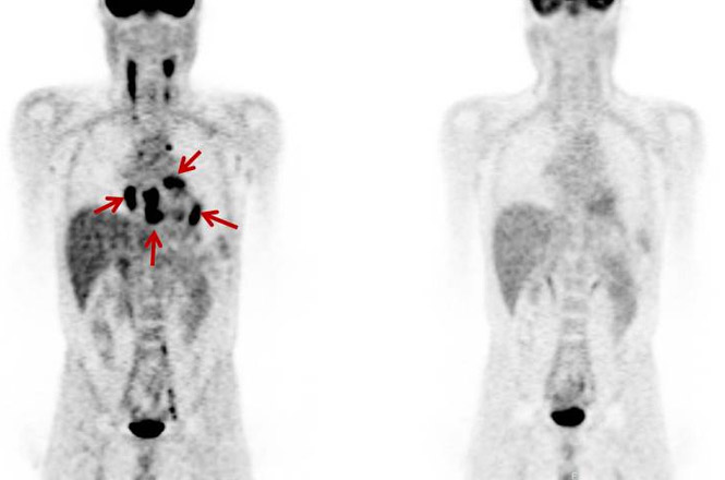 心筋に集積を認め、活動性のある心サルコイドーシスと診断された(左下図)。治療後は心筋への異常集積は消失し、治療効果が確認された(右下図)。