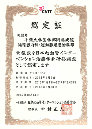 一般社団法人 日本心血管インターベンション治療学会 研修施設認定証