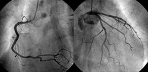 病気の診断には冠動脈のかたちを直接撮影する冠動脈造影検査(心臓カテーテル検査の一種)が用いられます。 これによって、冠動脈の狭窄の部位や程度を評価して治療方針を決定することが可能です。 また前述した冠攣縮性狭心症の診断のための冠攣縮誘発試験もおこないます。