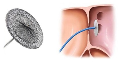 左右の心房の隔壁(心房中隔)に先天的に隙間があり(卵円孔開存)、下肢の静脈などにできた血栓がその隙間を通って脳の血管を詰まらせることで脳梗塞を発症する場合があります。そのような脳梗塞の再発予防のためにカテーテルを用いて卵円孔を閉鎖する治療を行っています。脳梗塞には様々な原因がありますので、脳外科と協力しながら慎重に治療方針の決定を行うよう努めています。