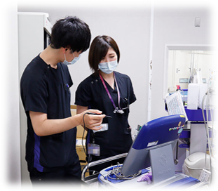 臨床工学技士はデバイスの新規植込みやジェネレータの交換を行っています。また外来や遠隔モニタリングでのデバイスチェックなど退院後のフォローアップも技士が担当しています。
