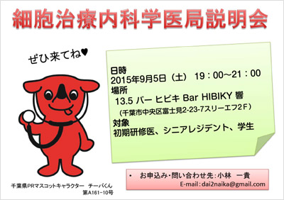 | 問合わせ先 | 細胞治療内科学 医局 TEL:043-222-7171(内線5253) E-mail:saibounaika(ここにアットマーク)outlook.jp |