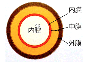 動脈の壁は内膜、中膜、外膜の三層構造になっています(図)。動脈解離とは、内膜に亀裂ができて、そこから動脈の壁が裂けていく病気です。解離を起こした動脈を断面でみると2つの腔になっており、もともと血液の通り道であった真腔と、解離を起こしたあとに壁の間に血流路ができた偽腔とにわかれています。大動脈解離は突然おこる病気で、起こしてまもない状態を急性大動脈解離といいます。急性大動脈解離の発症時には、今までに経験したことのない激しい胸痛、背部痛が突然に出現します。解離に伴う血流の障害から、手足の冷感や痛み、心不全による呼吸困難、心タンポナーデによるショック、心筋梗塞による胸痛、脳梗塞による麻痺、脊髄虚血による下半身麻痺、腸管壊死による腹痛など、様々な症状を認める場合があります。大動脈解離を起こした血管壁は薄いため、径が大きくなりやすく、大動脈解離によって大動脈がふくれた状態を解離性大動脈瘤といいます。