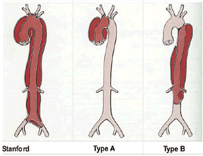 急性大動脈解離は、上行大動脈に解離があるA型、と、上行大動脈に解離がないB型 ( Stanford分類 )に分けられます(図)。