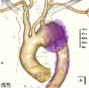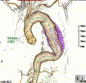 胸部大動脈瘤は胸の大動脈がふくれる病気です。場所により、上行大動脈瘤、弓部大動脈瘤、下行大動脈瘤と呼ばれます。真性瘤の場合、正常の2倍以上にふくれると破裂する危険性が高くなり、治療が必要となります。どの部位でも、直径60mm以上のもの、有痛性のもの、壁の一部分が突出する形でふくれる(嚢状瘤)ものは破裂の危険性が高く、手術を行う必要があります。