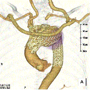 一方、下行大動脈の瘤については、頸部分枝から距離がある場合には、その治療成績、手術侵襲の低さからステントグラフト治療が、第一選択に行われます(図)。