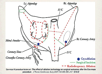 当科では、開心術を行う患者さんで心房細動を合併されている方に対して、不整脈手術を積極的に行ってきています。対象となる患者さんは、主に、僧帽弁疾患に合併した心房細動で、僧帽弁に対する心臓手術を行う場合(日本循環器病学会ガイドライン:Class I)や、僧帽弁以外の器質的心疾患に対する心臓手術を行う場合(同ガイドライン:Class Ⅱa)です。方法としては、現在、心房細動に対する手術として一般的に行われているメイズ手術(Cox-Maze Ⅳ)を取り入れています。この手術の原理は、アブレーションデバイス等の装置を用いた電気的焼灼や冷凍凝固を組み合わせて、心房に電気的な隔離線を作成し、細動が起こらないようにするものです。