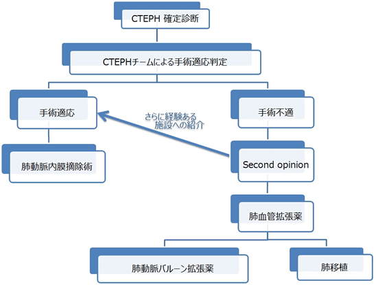 肺動脈内膜摘除術の適応は、経験のあるPEA外科医を含む専門医チーム(CTEPHチーム)が行うべきです。特に画像検査は器質化血栓の量や程度を過小評価するため、経験の少ない施設では手術適応と判断される患者さんが少なくなります。CTEPHと診断されたら、BPAセンターではなく、CTEPHチームのある施設に紹介することが重要です。