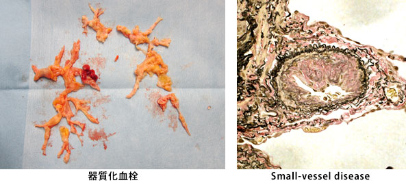 肺動脈に器質化血栓が塞栓し、肺高血圧となる病気です。本疾患の本態は、中枢(弾性動脈:主肺動脈〜亜区域枝)の器質化血栓と末梢(筋性動脈)のSmall-vessel diseaseです。器質化血栓により肺動脈圧が上昇し、筋性動脈が高血圧にさらされることでSmall-vessel diseaseが進行します。その結果、血栓の増悪がなくとも肺高血圧が進行していきます。また、肺動脈が閉塞した領域は肺血流が少なく、開存している領域は多くなり、換気血流不均等をおこします。さらに、肺高血圧が進行すると右心不全となり、心拍出量が減少します。