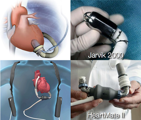 補助人工心臓は、日本には様々に装置が使用可能なりましたが、基本的には血液ポンプ、制御駆動装置、エネルギー供給システム等から構成され、血液ポンプの留置の位置により体外設置型と体内設置型(植込み型)に分かれます。補助人工心臓には、左心室の補助を行う左心補助人工心臓(LVAD)と、右心室の補助を行う右心補助人工心臓(RVAD)があり、心不全の種類によって選択され、左右のVADを必要とする場合もあります。 主に使用される左室補助人工心臓(LVAD)は、血液を心臓の左心室または左心房から受け取り、全身(大動脈)へと送り出すものです。心臓から血液を引き出す管(脱血管)と、大動脈へ血液を送り込む管(送血管)を取り付け、それらは血液ポンプに接続されます。血液ポンプは、空気の陰圧/陽圧あるいは電子遠心装置により駆動され、それに連結した制御駆動装置でその機能を調節します。