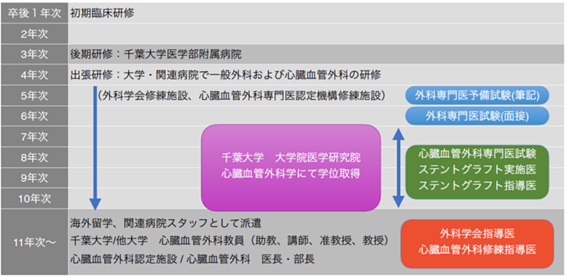 千葉大学医学部附属病院心臓血管外科では手術症例が多く、重症例の管理や難易度の高い手術が経験できます。また、関連病院は心臓血管外科専門医認定機構認定修練施設であり、術者としての経験を多く積む事が可能です。日本外科学会専門医、心臓血管外科専門医だけでなく指導医やステントグラフト実施医・専門医なども取得できまます。将来は大学病院教員、関連施設の責任者となるべく知識・実技はもちろんのこと、リーダーシップをとれる心臓血管外科医の養成を目標とします。