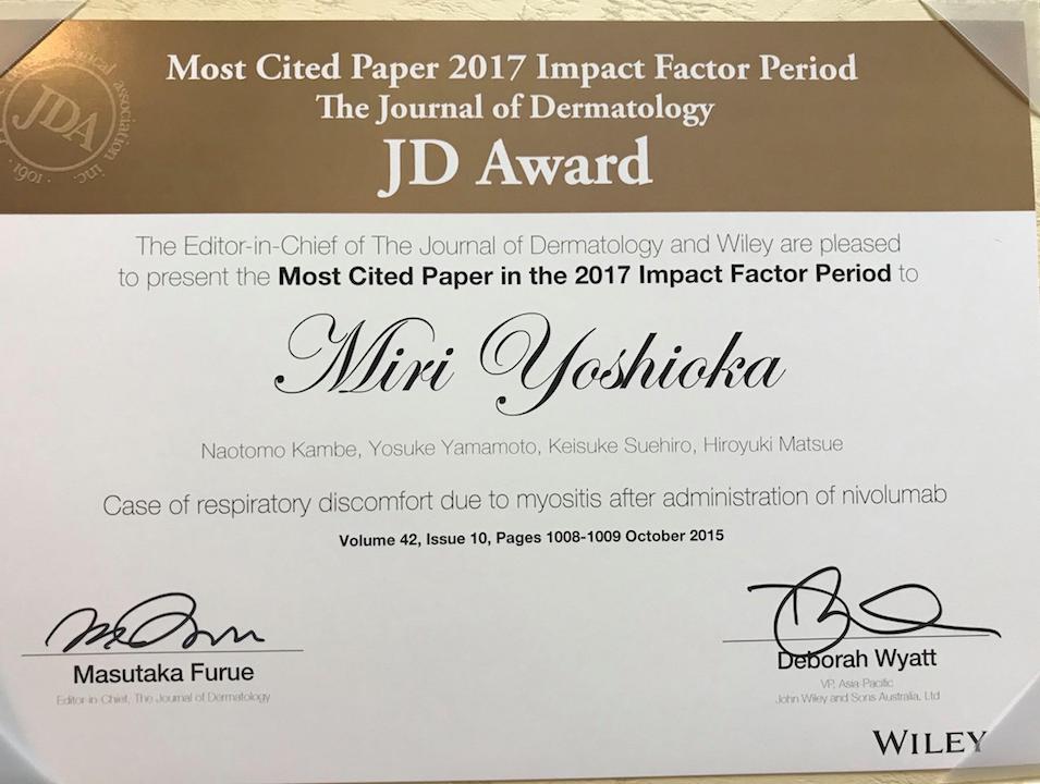 当科の吉岡未里先生らによる症例報告がJD Award "Most cited Paper 2017 Impact Factor Period (The Journal of Dermatology)"として表彰されました。