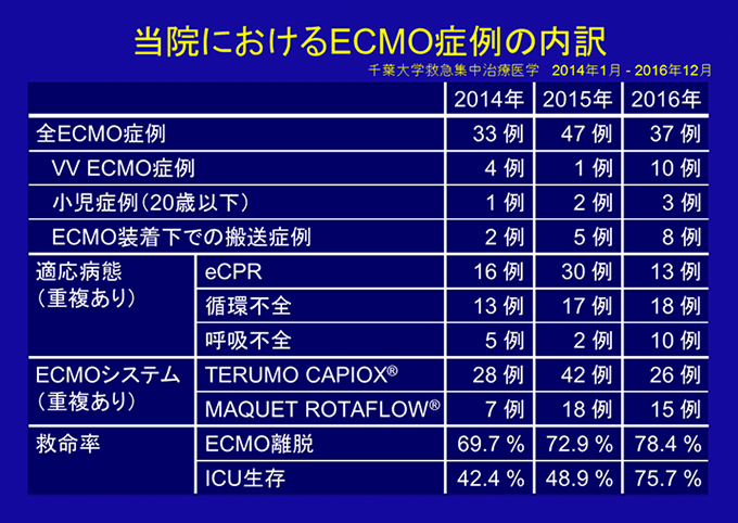 本邦におけるECMOは,体外循環を用いた心肺蘇生(extracorporeal cardio-pulmonary resuscitation: eCPR)での使用が多く,行える施設数が多い反面,1施設当たりの症例数が限られているという問題があります.当院ではeCPRを含む様々な病態に対してECMO治療を行っています.