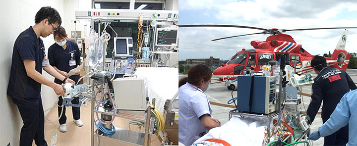 当院では,院内急変患者発生時に,当科の医師・看護師からなる急変対応チーム(medical emergency team; MET)が出動し治療を行うRapid Responseシステムが確立していますが,院内心停止症例に対してECMOが必要であれば,METが迅速にEMCOを導入します.一般病棟やCT室で導入することもあります.また当院は,心臓血管外科を中心に補助人工心臓(ventricular assist device; VAD)を用いた重症心不全の外科治療にも積極的に取り組んでおり,また,呼吸器外科を中心として肺移植も行っています.当科では,それらの症例に対するECMOを含む人工補助療法を駆使した集中治療も行っています.