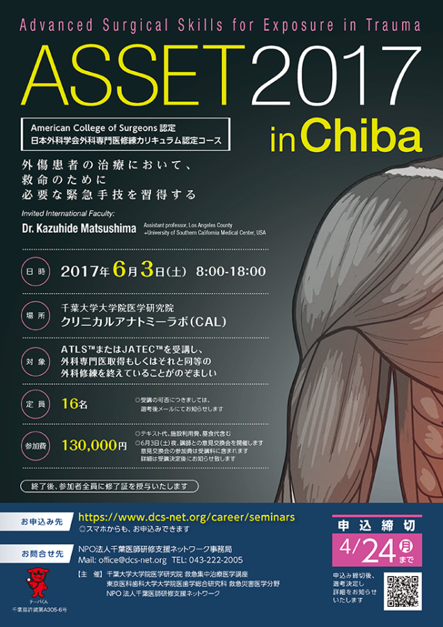 本年6月3日に、本邦3回目となるAdvanced Surgical Skills for Exposure in Trauma (ASSET)コースを千葉大学クリニカルアナトミーラボ (CAL)にて開催いたします。本コースは、外傷において致命的となる、四肢・体幹部の血管損傷に焦点をあて、主要血管への迅速かつ安全なアプローチを目的とした、cadaverを使った米国外科学会認定のトレーニングコースです。日本外科学会外科専門医修練カリキュラムコースにも認定されています。