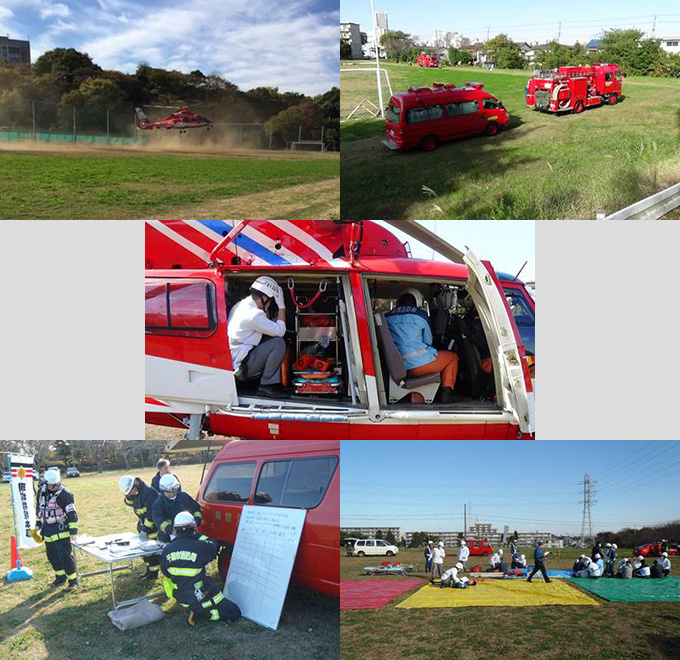 2014年11月18日(火),当科と千葉県救急医療センター,千葉市消防局が企画立案した「消防ヘリによるドクターピックアップ方式(DPU)での救急活動連携訓練」が実施されました.この訓練は,平成24年1月から当科で運用し,同年6月には、千葉県救急医療センターが参画して展開しているDPUを活用し,多数傷病者発生時において災害現場でのトリアージ能力並びに応急救護活動能力向上を企図したものです.発生現場としては花見川区の千葉工業大学グランドをお借りし,花見川消防署のほとんどの隊員が参加しての大規模な現場活動訓練が,実災害に則して行われました.