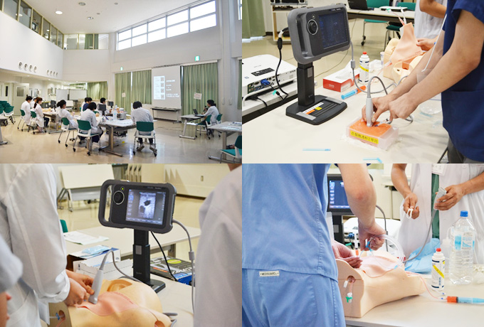 県内の医療機関から初期研修医8名、後期研修医1名が参加され、シミュレーター機器を使用し超音波ガイド下で中心静脈穿刺トレーニングを行いました。