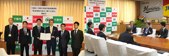 2017年3月23日,千葉市役所市長応接室において,千葉市と千葉大学病院の間に「災害事故における救急業務の協力に関する協定」が締結されました.締結式には,熊谷俊人千葉市長,山本修一千葉大学病院長のほか,当科の織田教授,安部講師も出席しました.