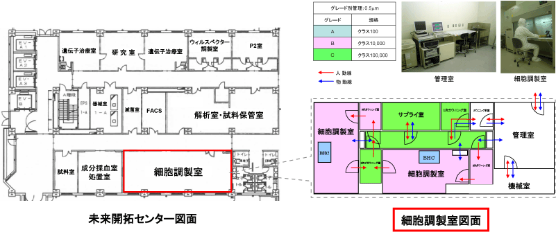 高いレベルの無菌状態(清浄度)・温度・湿度・室圧が維持された環境下で細胞の管理および調製の実施が可能な施設で、当センターでは2室の調製室が設置されている。CPC内ではブロックごとに設定されたグレードに応じて無塵衣を着用する。また、空気の流れを制御し汚染物の浸入を防ぐ目的でブロックごとに差圧の管理をし、さらに、交差汚染対策の目的でブロック間は一方通行を設定しており、極めて衛生的な環境を整備している。