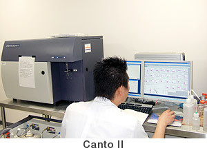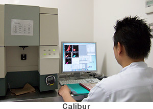 個々の細胞にレーザー光を照射し、散乱光および蛍光を測定することで、細胞の光学的解析を行う。また、細胞分離装置を使用することで生きたまま細胞を分離することも可能。