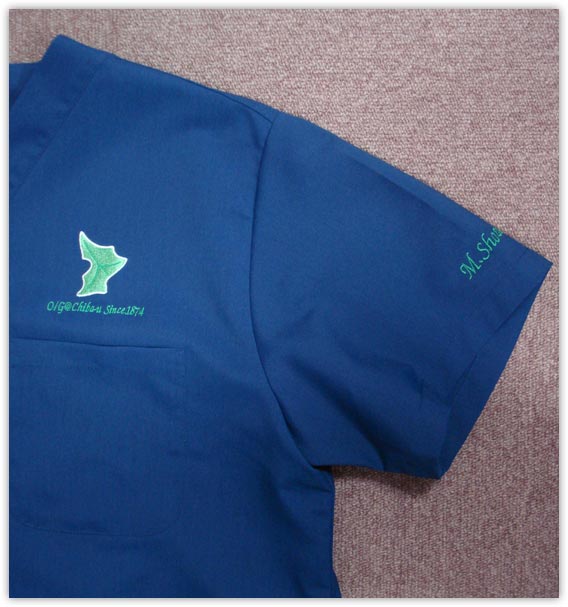 教室のロゴマーク作成しました。千葉と葉脈をイメージしています。ロゴ入りユニフォームも作成しました。