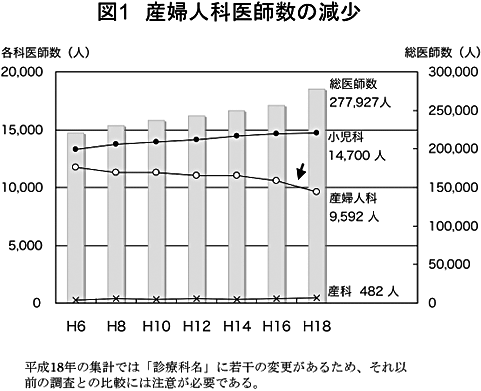 医療崩壊には、後述するように大学病院への医師の引き上げや経営圧力などを契機とする自治体病院の診療科崩壊、その結果残った病院の負担増に伴う崩壊のドミノ倒し的連鎖・救急医療体制の崩壊など多くの診療科で共通する様相がある。これらは、診療業務の増加と人手不足を背景とする点で共通している。しかし、医師の絶対数が大幅に減少を続けている点で、産科医療の抱えている問題は最も深刻と思われる。これには “分娩はかつてないほど安全になったが、産科医であり続けることはかつてないほど危険である”という言葉に象徴されるように、県立大野病院事件が与えた心理的ダメージは甚大であった。家族である医師に熱心に産科以外の診療科への転向をすすられた産科医もいた。