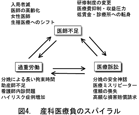 体外受精を中心とする生殖補助医療の発展もまた負のスパイラルを加速させる要因のひとつとなった。高度生殖補助技術に特化するため分娩取り扱いをやめる医師が増加した。また、高度治療により従来では妊娠が困難であった高齢者の妊娠、多胎妊娠率の上昇など高度管理が必要なハイリスク妊娠が増加し、産科医・新生児科医師の負担を増加させた。そのほかの因子については図4に記したので参照されたい。
