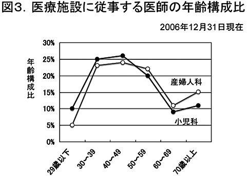 さらに、長期的な新人医師の減少は産婦人科医師の高齢化をもたらした。最新の厚労省の集計(平成18年医師・歯科医師・薬剤師調査の概況)によれば、2006年12月31日の段階で医療施設に従事する全医師の平均年齢が48.1歳であるのに対し、産婦人科は51.3歳と高い。図3に小児科医師との年齢構成比の比較を示す。小児科の年齢構成比は医師全体の年齢構成比と完全に一致する。産婦人科では引退前の年齢にある医師の割合が高く、今後も引退者の多い状況が持続すると考えられる。