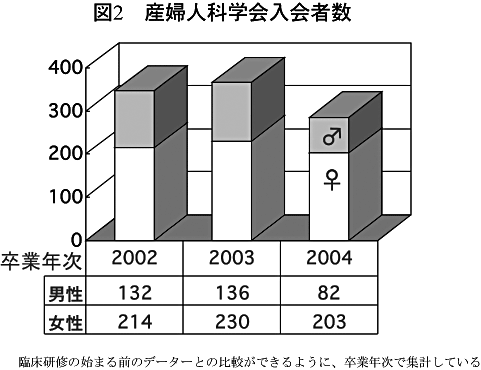さらに、この10年あまり医学部入学者に占める女性の割合が上昇し、産婦人科入局者に占める女性の割合もすでに8割に近い。女性医師の増加は喜ばしいことであるが、妊娠分娩・育児や家事の負担を考慮すると女性医師の労働力は男性医師の0.7(あるいは0.5)と見なされている。子供の数が増えるに従って母性医師の就業率は低下し、大学卒業後10年で半数の女性医師が分娩を扱わなくなる。母性医師がかろうじて外来勤務にふみとどまって勤務を続ける場合でも、当直勤務の増えた男性医師に不平等感が広まるというやっかいな問題が一部に発生している。