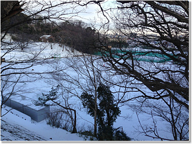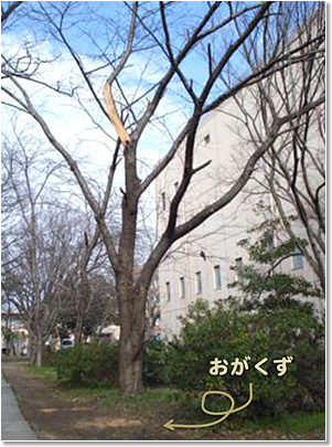 先々週末千葉でも大雪になりました(写真1)。雪の重みで、千葉大医学部正面玄関前の桜の大木が幹から折れてしまいました。折れた枝は、チェーンソーのお世話になって、いまはおがくずが残るのみです(写真2)。