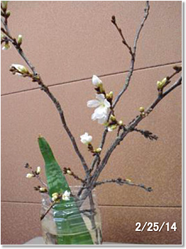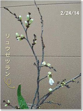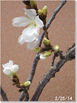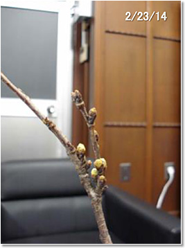さて、チェーンソーのお世話になる前に、折れた幹から小枝を3本手折ってきました。ペットボトルに入れて(先客のリュウゼツランと同居です)おきました。1週間は変化なし、ところがおとといになって急につぼみが膨らみだし(写真5)、ついに昨日(写真6)から今日(写真7と8)にかけて開花しました。日中18度(夜間は温度不詳です)の私の部屋です。