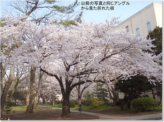 折れた枝をそのままにすると感染などでだめになることが多いそうです。折れた枝は地上から届かない高さにあり、当然のことながらそのままになっていましたが、無事開花しました。周囲の桜と同時の開花です。