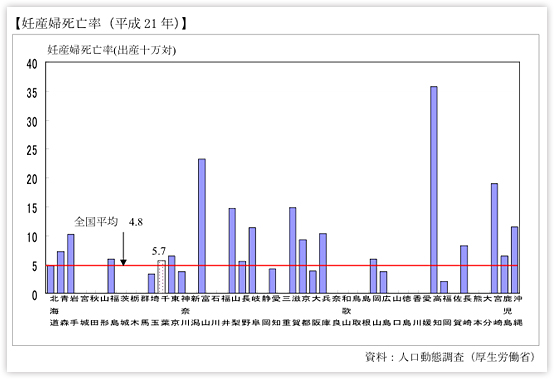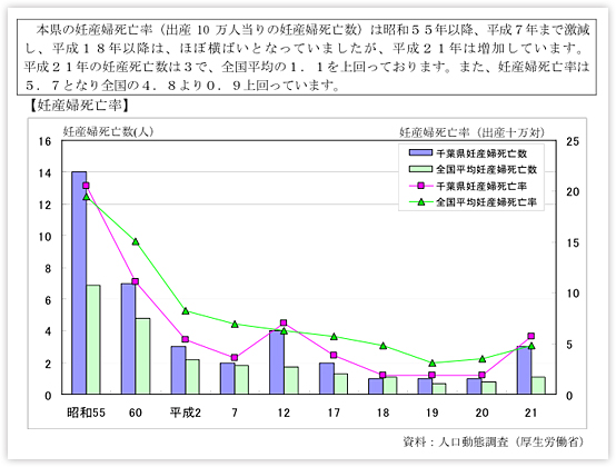 千葉県では毎年5万件あまりの分娩がありますが、妊産婦死亡は、平成21年が5名、平成22年と23年がそれぞれ3名で、平成21年以降全国平均よりやや高い状況が続いています。