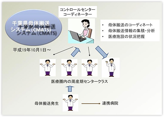 平成19年より、県内の産科施設を対象とする母体搬送システムが稼働しています。これは、一次施設(診療所)あるいは二次医療施設(病院)から、早産などの妊婦を他院に搬送する必要が生じたときに、医療者に代わってコーディネーター(事務者)が空床のある施設を探すというシステムです。