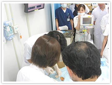 第1回の講習会は輸血部との連係がテーマで、参加者からは有益であったと好評を博しました。2回目の今回はICUとの連係をテーマに、3階のセンターからシミュレーターを借用して、下記のように開催されました。講師の中村医師の熱意と参加者の学習意欲の高さで大変熱い講習会となりました。