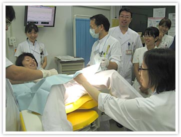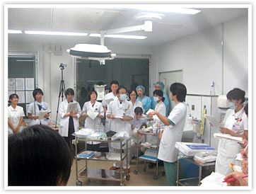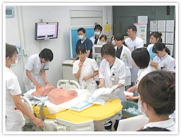 千葉大学病院周産期母性科では、いつ誰が遭遇しても実行できる当科独自の「産科危機的大出血への対応フローチャート」を、田中医師と鳥越助産師を中心に作成中で、すでに完成間近となっています。暫定のフローチャート部分については、定期的にシミュレーション講習会を開催し問題点の抽出と科全体への浸透を図っています。