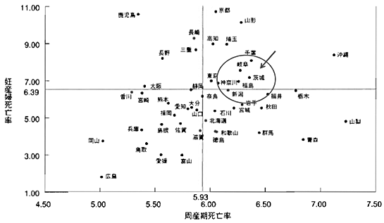 図2 都道府県別妊産婦死亡率と周産期死亡率(1995-2004年)