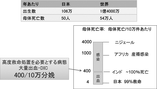 平均すると妊婦の250例中1例に、大量出血や高血圧・脳出血など生命にかかわる重篤な病態が発生します。一部の発展途上国では、このような危機的状態に陥る妊婦のほとんどすべてが死亡しています(図1)。
