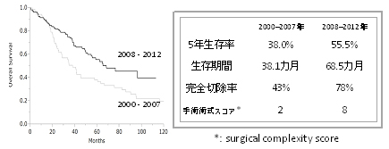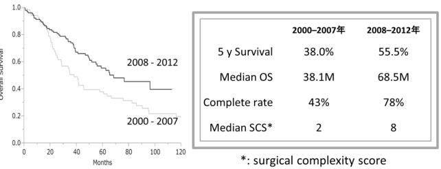 卵巣がん治療専門チームを立ち上げて拡大手術を導入した。 手術術式スコアは2点から8点に増加した。 完全切除率は43%から78%に増加した。 生存期間の中央値は38.1ヶ月から68.5ヶ月に延長した。 術後3か月以内の死亡した患者さんはいなかった。
