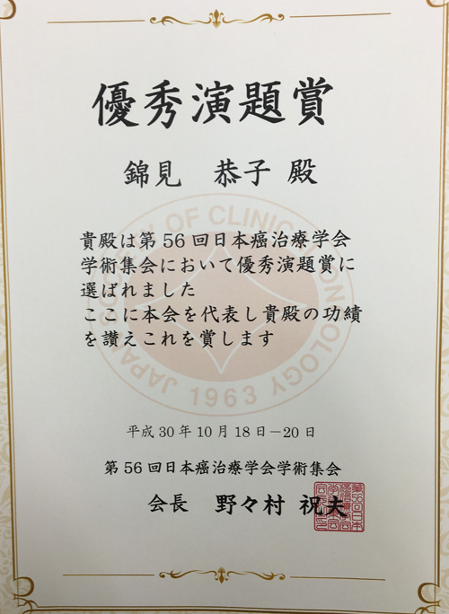 第56回日本癌治療学会が横浜で開催され、錦見恭子助教が超広汎子宮全摘術を用いた骨盤壁に強固に癒着する卵巣癌の摘出方法について口演し、優秀演題賞に選ばれました。