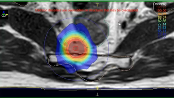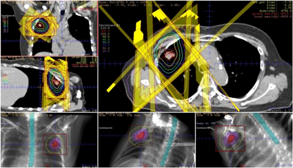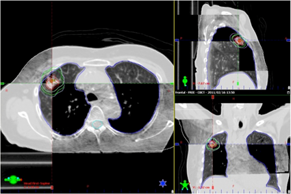 SRT(Stereotactic Radiotherapy:定位放射線治療)とは、局所的に多方向から放射線を投与する照射です。1回の照射で目的とする病変へ多くの線量を限局して与えることができるので、数回の照射で病変への放射線の効果を高めるとともに、治療計画時の画像との重ね合わせを行い、高精度な照射位置の再現をしてから放射線を照射します。