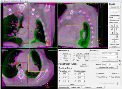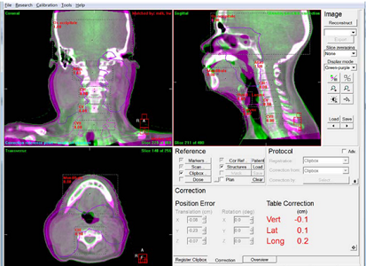 IGRTとは、照射の直前や照射中にX線写真やCT画像を取得して、治療計画時の画像と重ね合わせて、骨やマーカーなどをもとに正確に合わせ込みを行い、位置のずれの量を求めて寝台位置の修正を行ってから照射を行います。