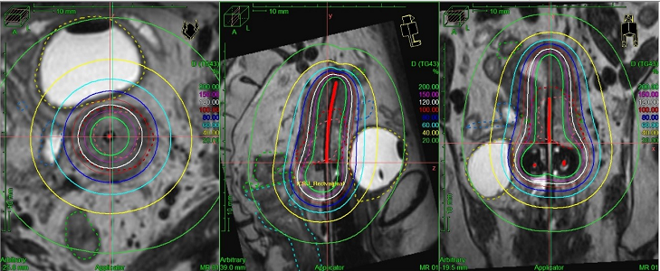 小線源治療には、ラルス(RALS:Remote After Loading System)という専用の医療機器が多く用いられます。この機器を用いて、粒状の小さな放射線源を身体の中に入れ、身体の中から放射線を当てる方法です。そのため、放射線を病変に限局し、かつ集中的に照射できるようになっています。従来は単純X線画像を用いて治療計画を行っていましたが2014年よりCT画像やMR画像を用いた三次元画像誘導密封小線源治療を開始しました。単純X線画像ではわからなかった腫瘍やリスク臓器が可視化できるため、より腫瘍に限局した照射ができリスク臓器の線量を下げることが可能になりました。