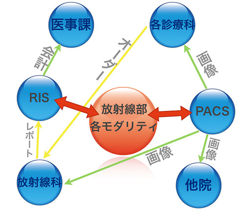 放射線部内のシステムは、各モダリティと接続されており、患者属性の入力、検査内容の通信、検査実績の受信などを行っています。画像との統合および部門内の情報共有をコンセプトに、患者サービスの向上、検査業務の円滑な遂行、正確な情報提供に寄与しています。